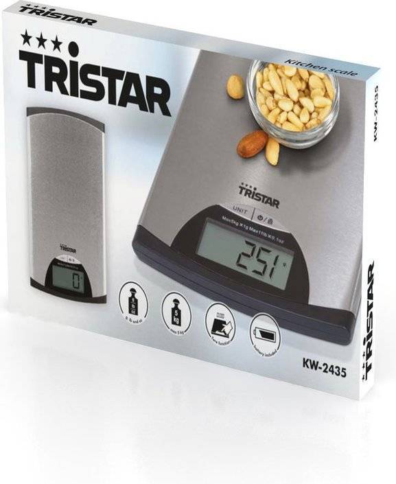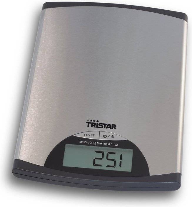 De Tristar RVS keukenweegschaal heeft een maximaal weegvermogen van 5 kg. U kunt zelf kiezen of u het gewicht in ponden (lbs) of kilogrammen weer wil laten geven. Het lcd-scherm is makkelijk af te lezen. De weegschaal weegt nauwkeurig op de gram, daarom kunt u de weegschaal ook gebruiken voor zeer lichte dingen, zoals brieven. Batterijen zijn bij de weegschaal inbegrepen.